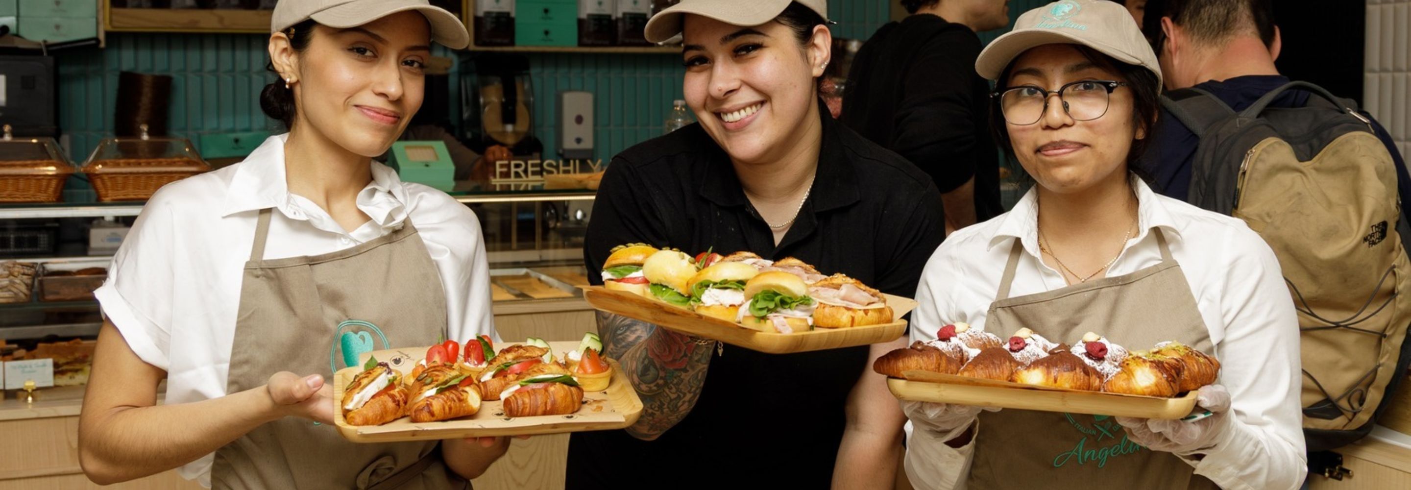 Angelina Italian Bakery is a quick-serve bakery concept specializing in Italian-influenced baked goods and café items, including croissants, donuts, cheese focaccia, pastries, cakes, and sandwiches.